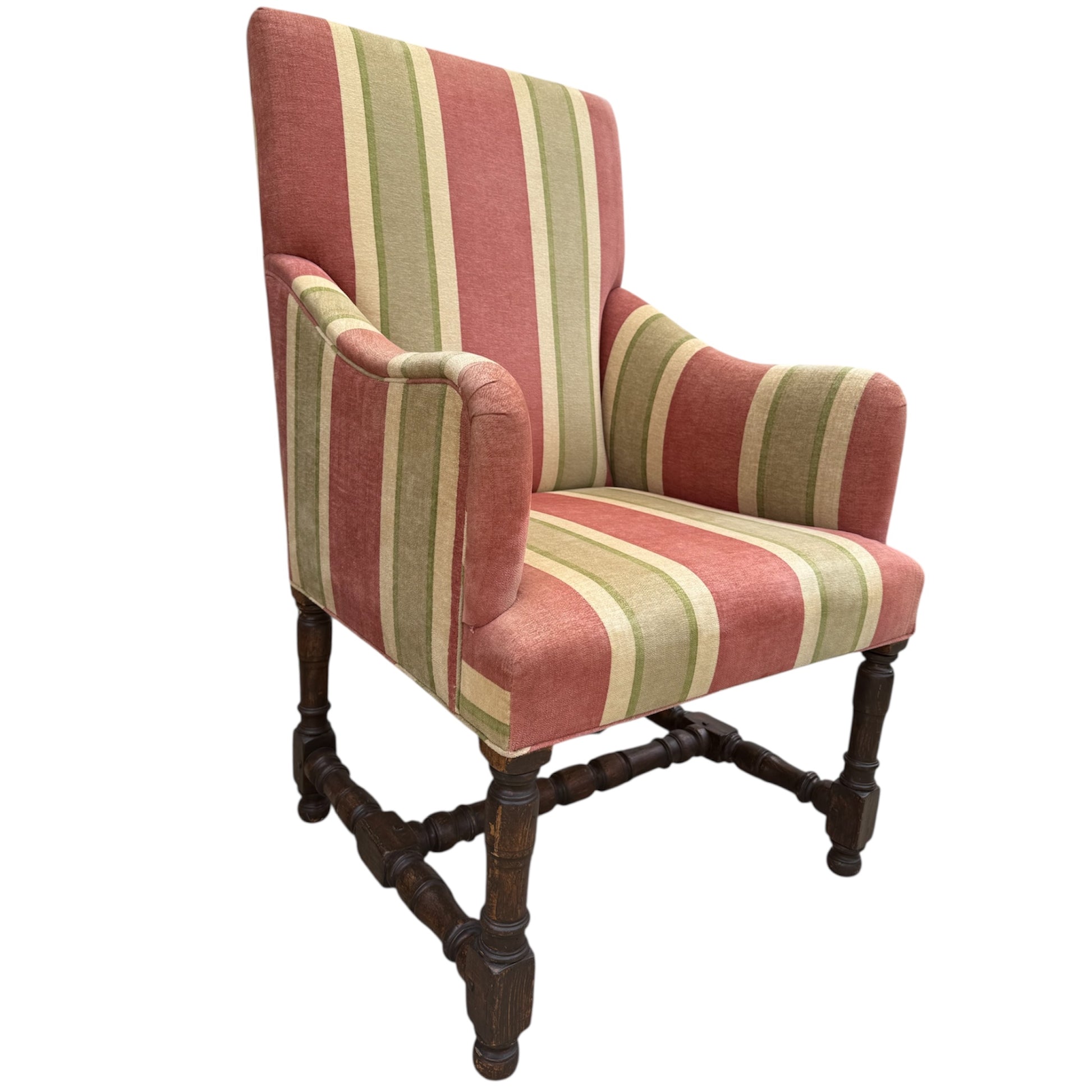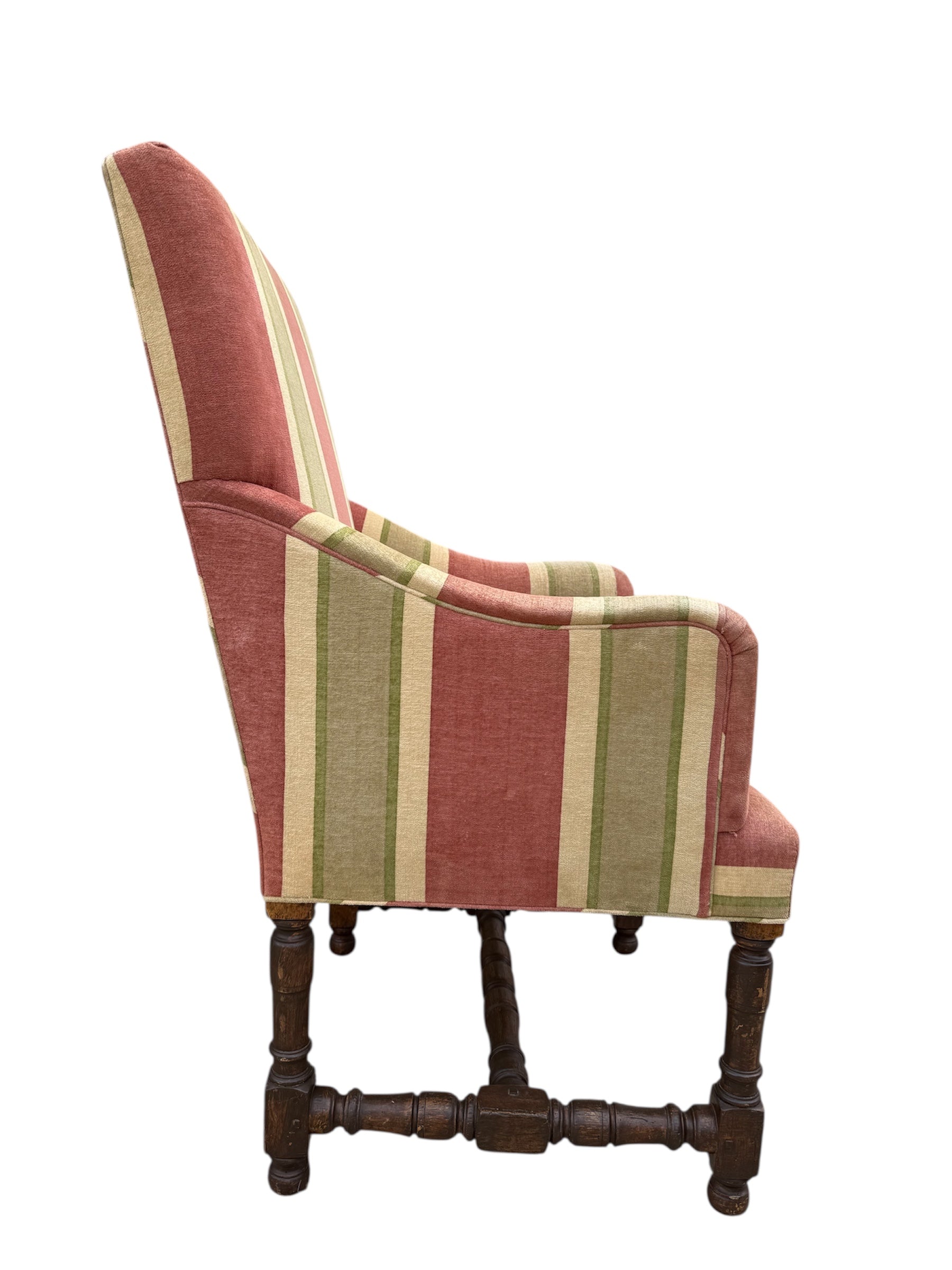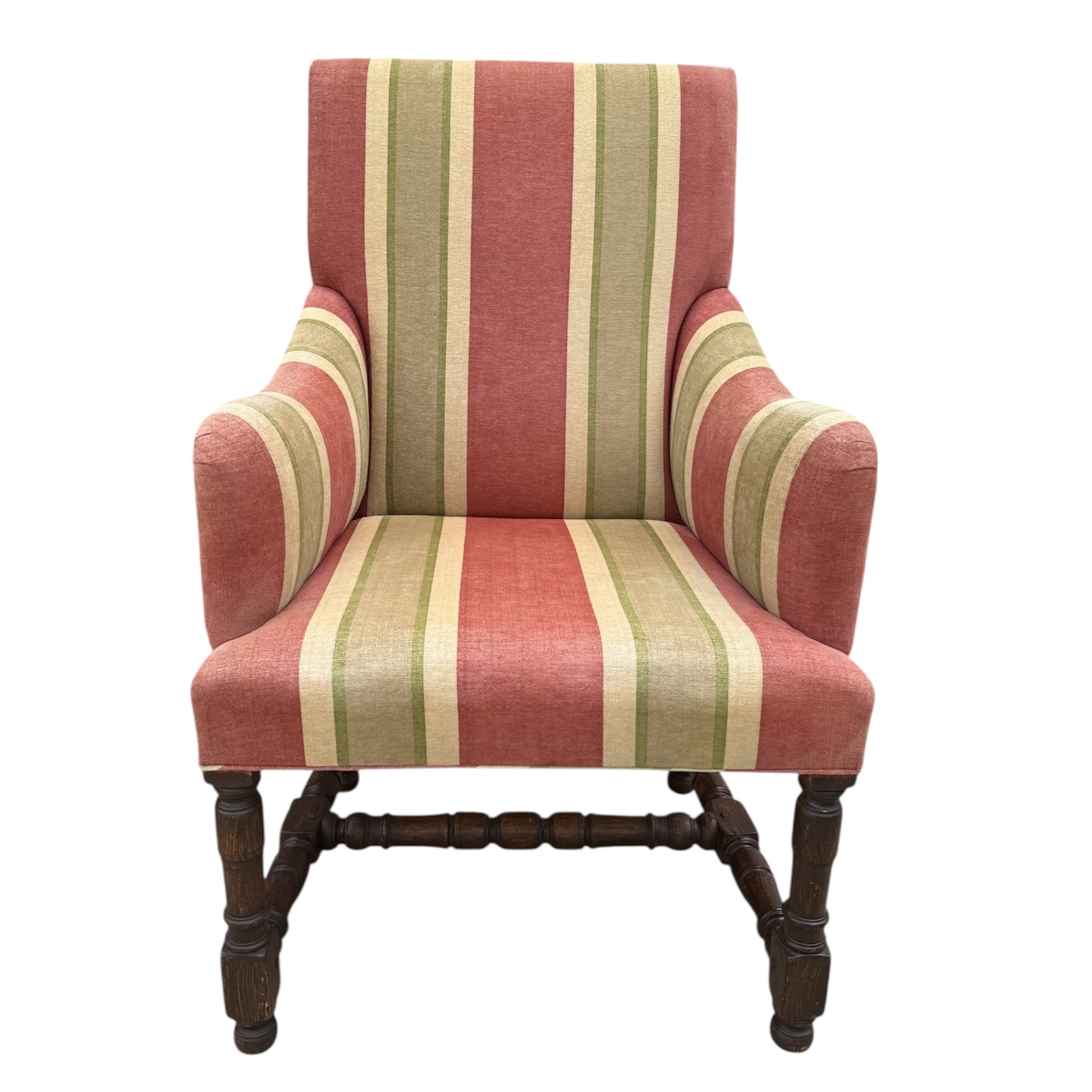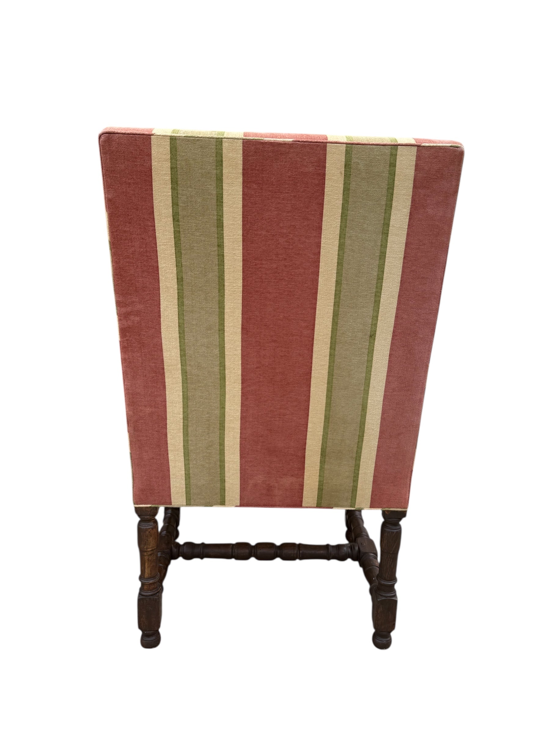 The Tuscany Bergere from sought-after designer Rose Tarlow. Custom with hand-carved walnut frames with a medium hand-rubbed walnut finish, the chairs feature spindle legs and stretchers with round bun feet. Striped chenille upholstery from Old World Weavers in rose, sage green, and cream colors. Timeless and classic style for any well-dressed interior. The custom size makes them perfect for either lounge or dining chairs.