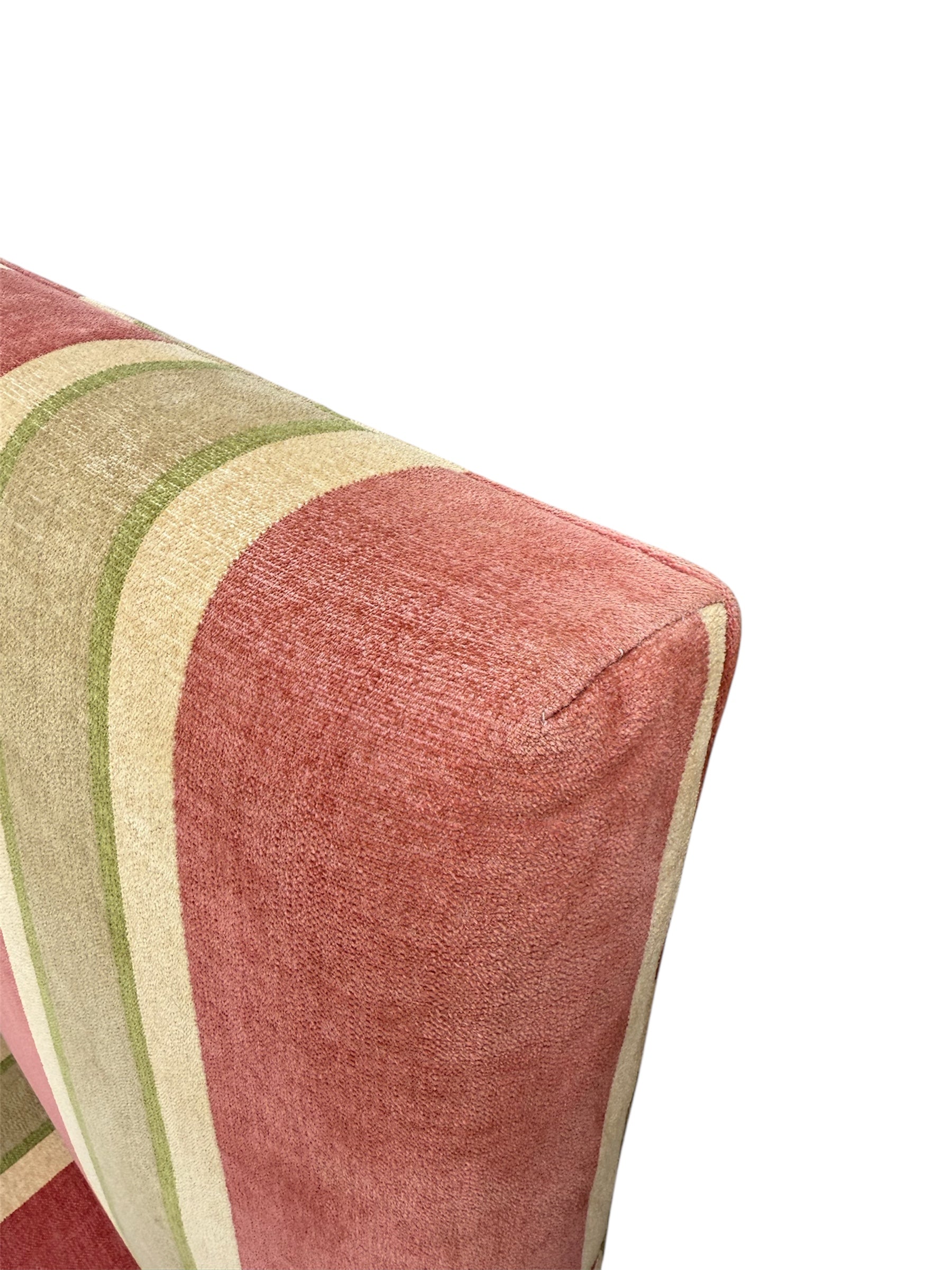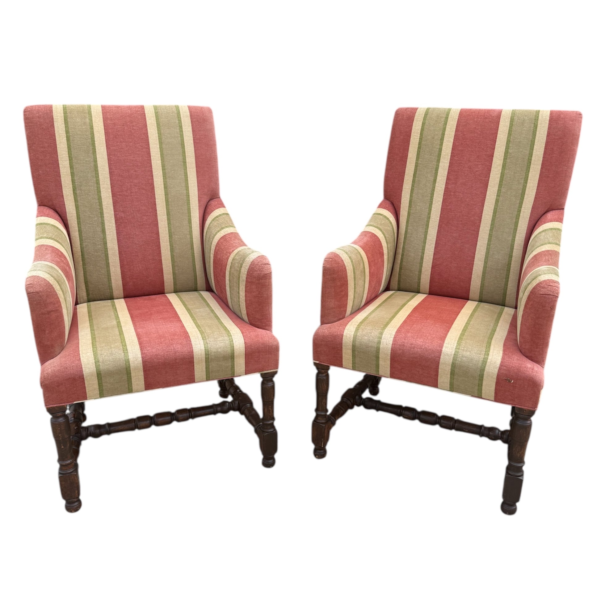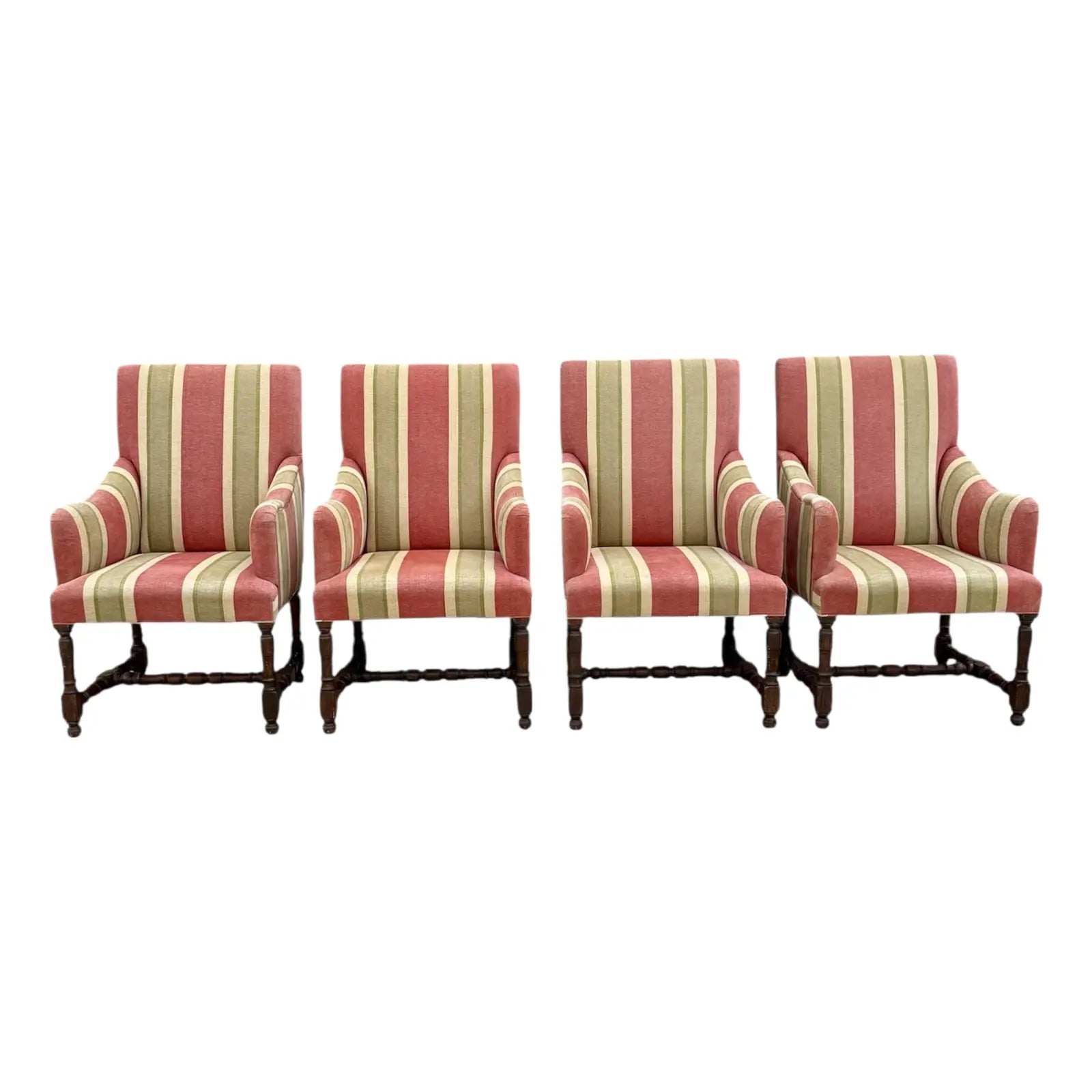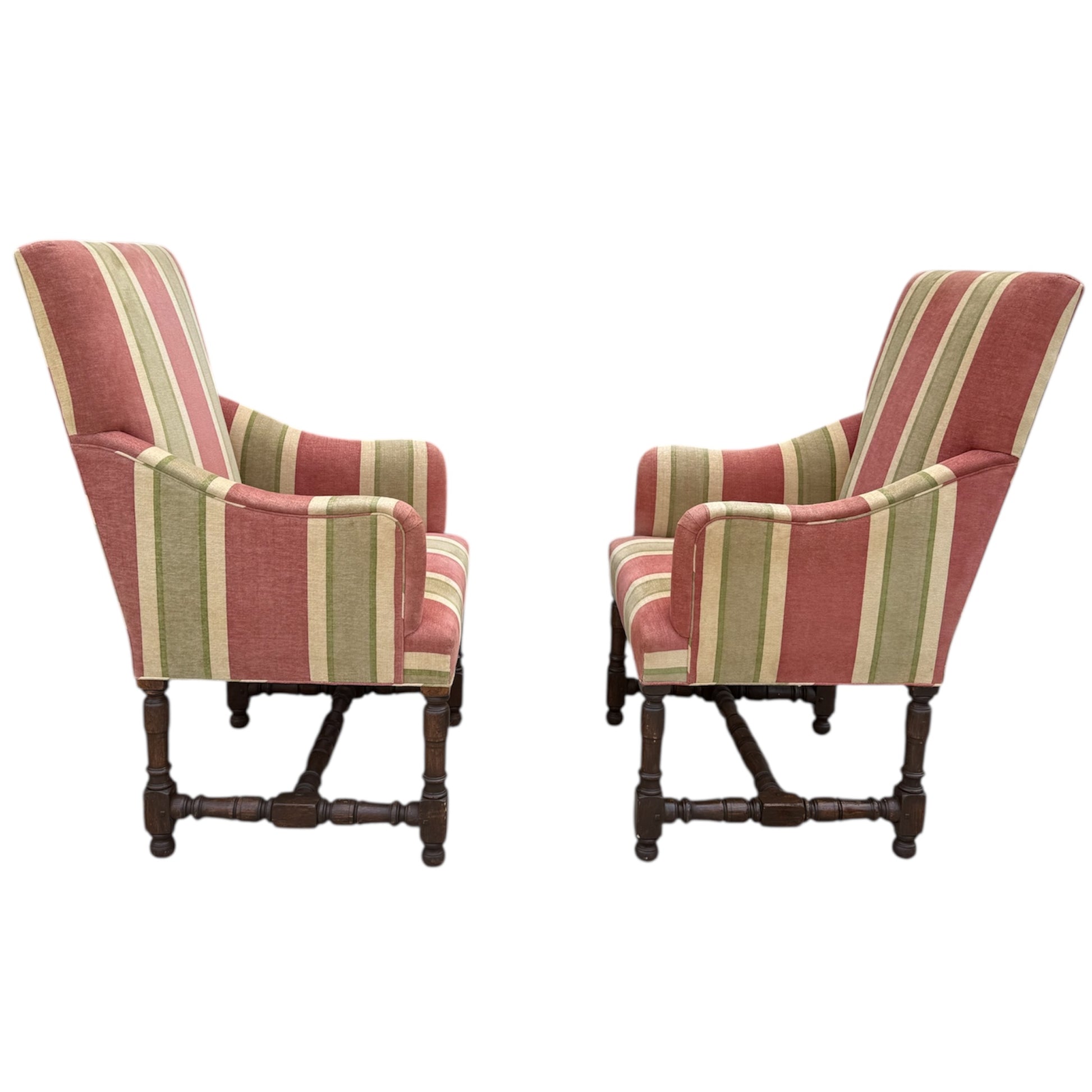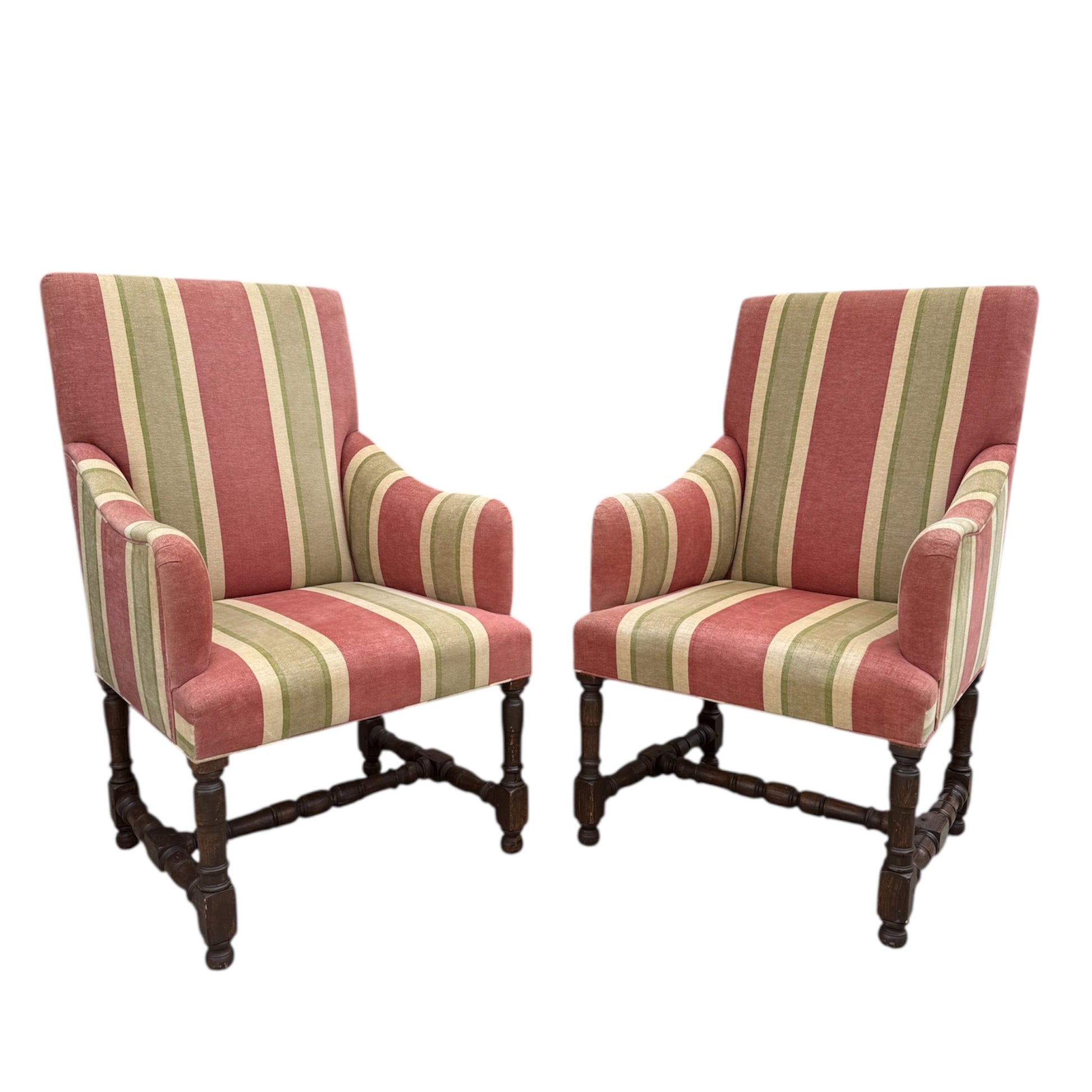 The Tuscany Bergere from sought-after designer Rose Tarlow. Custom with hand-carved walnut frames with a medium hand-rubbed walnut finish, the chairs feature spindle legs and stretchers with round bun feet. Striped chenille upholstery from Old World Weavers in rose, sage green, and cream colors. Timeless and classic style for any well-dressed interior. The custom size makes them perfect for either lounge or dining chairs.