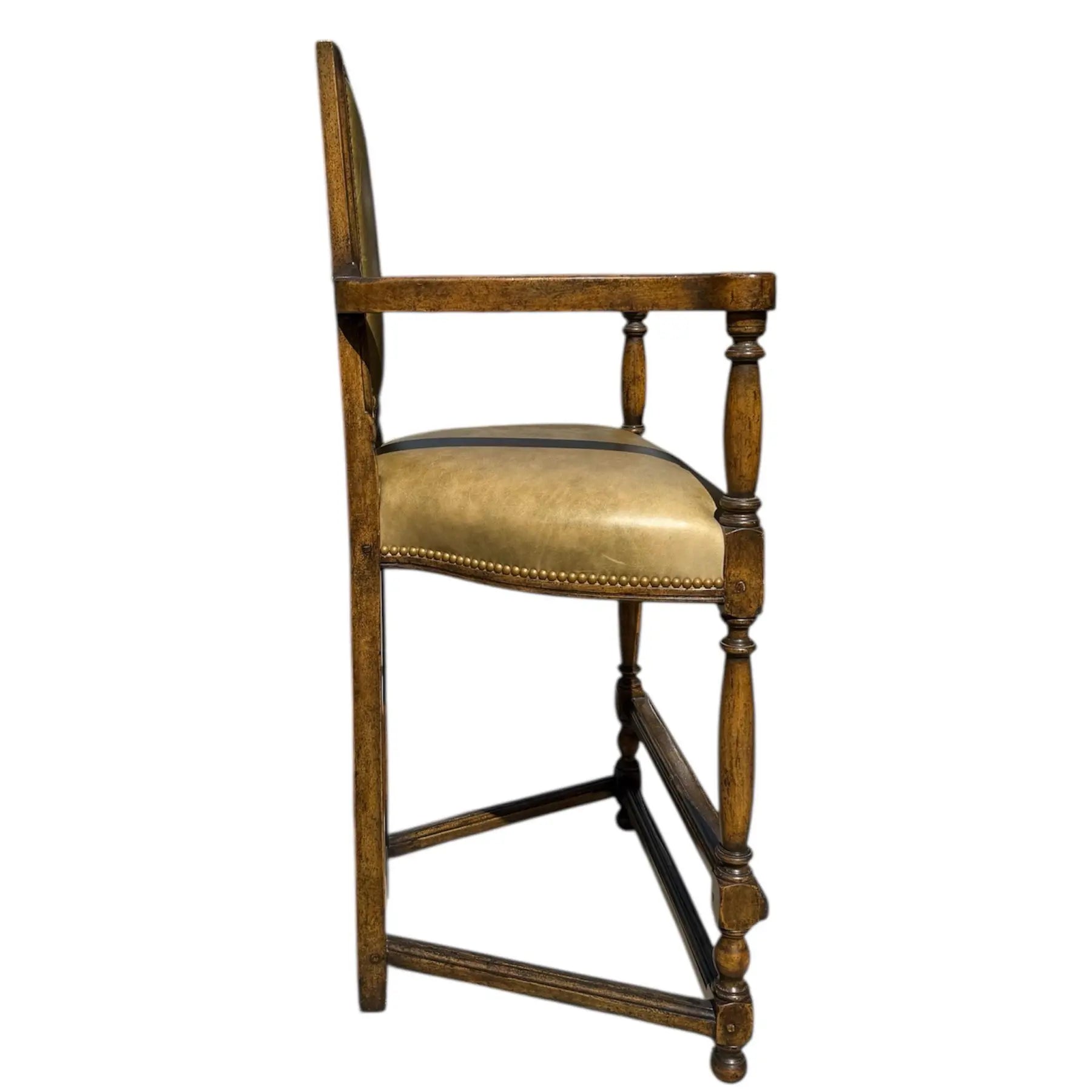 Crafted by Dennis and Leen, these counter stools represent a masterful interpretation of sixteenth-century French design aesthetics. Each piece features hand-carved walnut frames finished with an antiqued patina, paired with sumptuous full-grain French leather upholstery accented by antique brass nailhead detailing. Manufactured in Los Angeles by artisans specializing in historically-informed furniture, the Henry II collection captures the refined elegance and architectural sophistication characteristic of Northern Mannerism's most celebrated period.