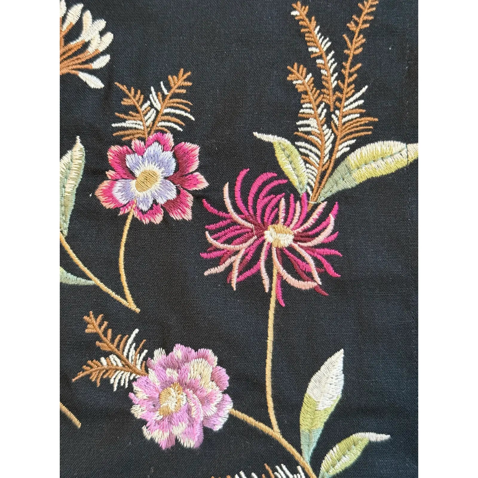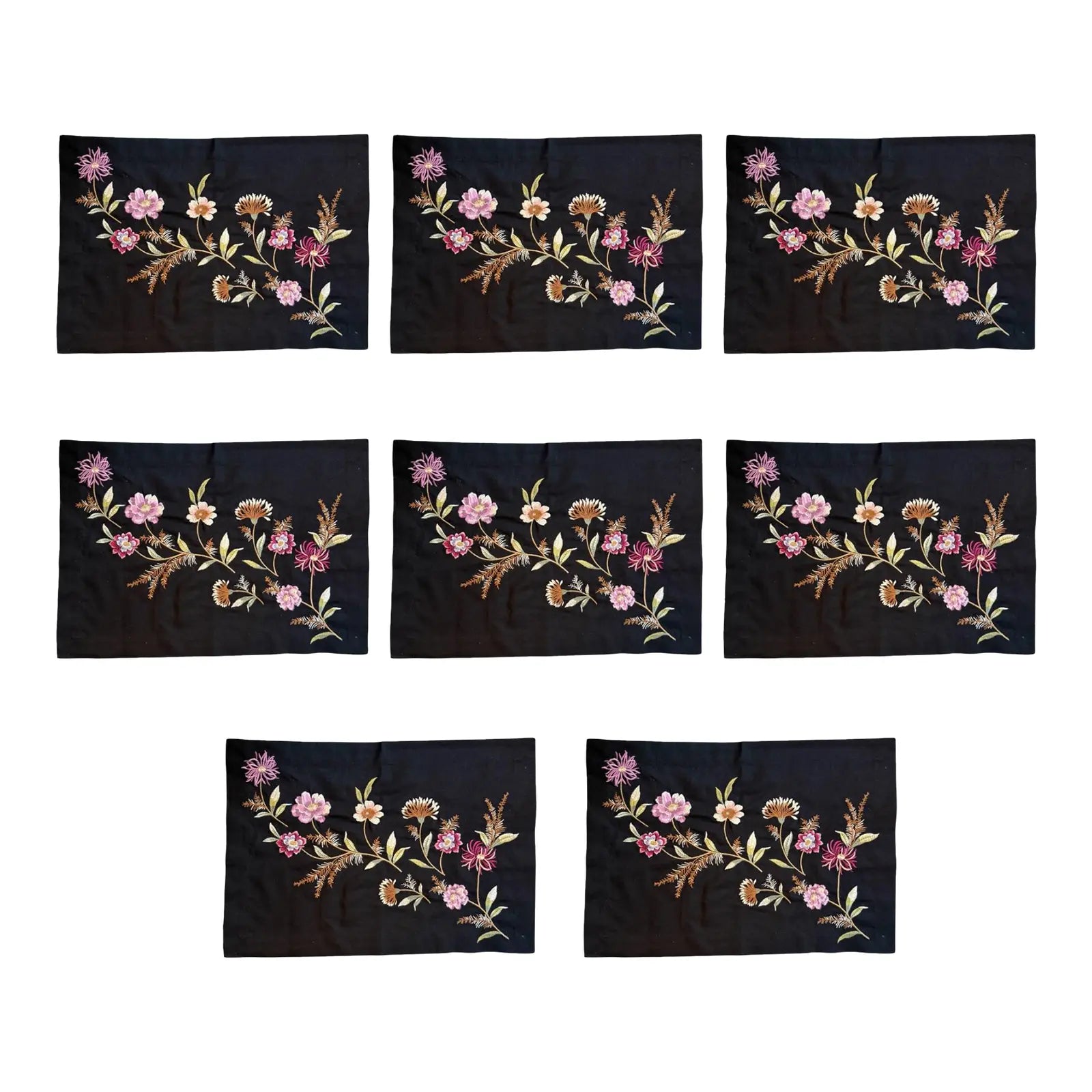 A set of beautifully embroidered linen placemats. Elegant and colorful floral sprays decorate black linen with stitched finished borders.