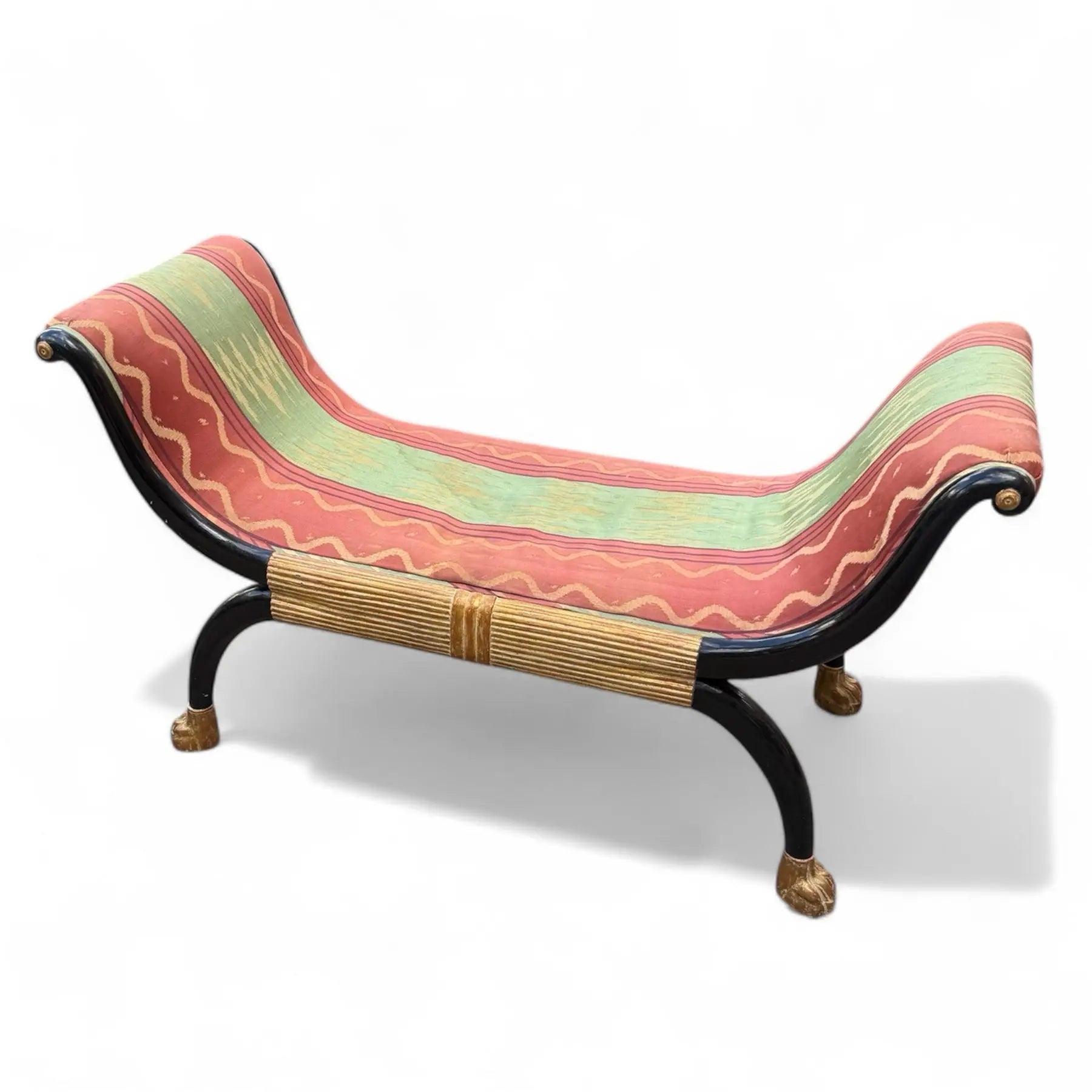 Stunning bench from prestigious Rose Tarlow Melrose House. The Regency Paw Foot Bench is from the archival collection and blends the elegant Regency style seamlessly with classic and revival styles. Signature crackled black lacquer with 18k gilt trim and accents. A rare and collectible piece no longer in production, ready to be reimagined for your space. See less